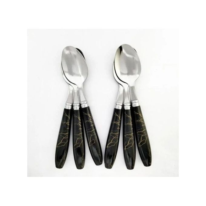 “Pack de 6 fourchettes de table en inox avec poignées en marbre élégantes.”